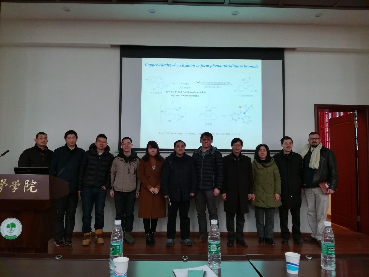 ,并在化学馆321报告厅进行了以“Synthesis of Natural Alkaloids and Pharmaceutical Compounds through the Metal-Mediated Coupling and Addition Reactions of Nitrile and Imine”题的学术报告,主要介绍了其研究小组在金属催化的腈插入反应、钯催化的双重C-H官能化反应,以及该方法在(+)-horsfiline、amaryllidaceae alkaloids、indenoisoquiinolediones等具有良好生物活性的天然产物的合成中的应用。谢仁傑教授在报告过程中语言幽默风趣,讲解深入浅出,激起了在座老师和同学的浓厚兴趣。报告结束后谢仁傑教授与现场师生进行了深入交流,现场学术氛围浓郁。