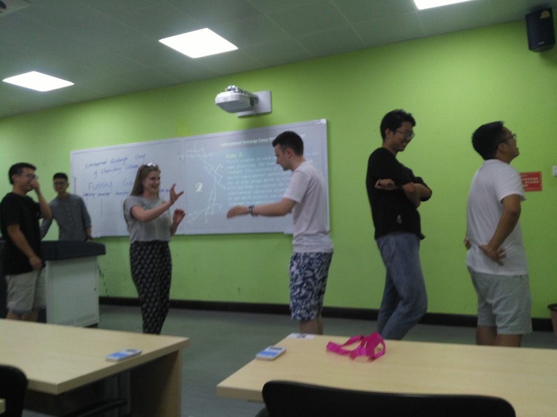 2017年7月7日14:20,来自英国约克大学的7名大学生与交流营23位成员在综合楼B座B305参加了趣味竞技游戏。