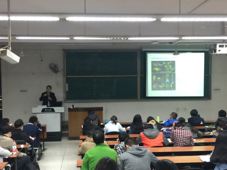 首先,吕弋教授为我们简单介绍了什么是发光。经过一些简单的例子,总结出目前发光分为两大类,分别是反应发光和光子发光。然后光子发光具体表现为分子荧光、磷光和矿物质发光等。接着,吕弋教授讲述了目前分子探针的一些研究成果。举了一些获得诺贝尔化学奖的超高分辨率荧光显微镜及荧光蛋白标记等例子,以便于我们更加生动具象的了解。最后,吕弋教授讲解了关于传感方面的知识和研究。让我们对这个领域有了清晰的认识。同时,在一个半小时的的讲座中,吕教授向同学们提问,进行互动,使整个讲座气氛十分活跃。