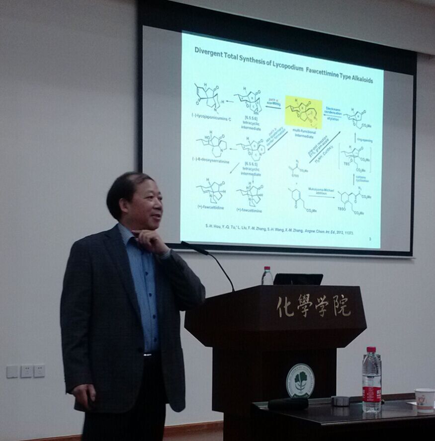 并进行了学术交流。在化学馆321报告厅,涂院士详细讲授了他所领导的课题组的特色研究:将构建手性季碳中心的Semipinacol Rearrangement和Schmidt Rearrangement与复杂天然产物全合成紧密结合。在底物的手性诱导或者手性催化剂作用下,该系列重排反应能够高效、高立体选择性地构建季碳手性中心,特别是螺环手性季碳中心。基于该方法学,涂院士课题组简捷高效地实现了一系列具有多个稠环和多个季碳中心的复杂天然产物的全合成,其中的代表性分子包括(+)-Alopecuridine、(+)-Sieboldine A、(−)-Lycojapodine A 、(-)-Lycojaponicumin C、(-)-8-Deoxyserratinine、(+)Fawcettimine、(+)Fawcettidine、Conidiogenone、Conidiogenol和Conidiogenone B等。此次学术报告会由性视频