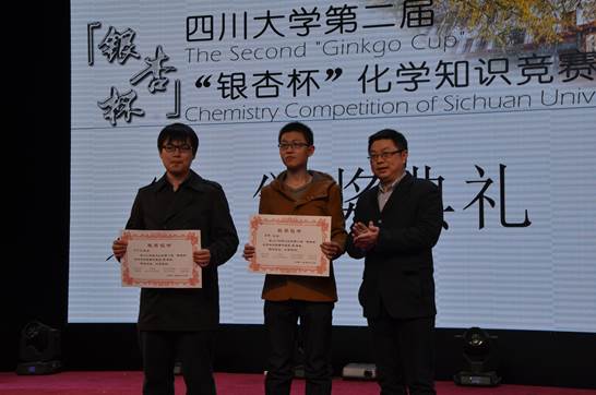 第二届“银杏杯”化学知识竞赛颁奖典礼,由谢均老师主持。余孝其院长对竞赛内容进行了详细的介绍,郭勇教授、王玉忠院士分别讲话,表达了对同学们认真学习科学文化知识、开拓创新、全面发展的殷切希望,王智猛书记宣布了获奖名单,由到场嘉宾向获奖同学颁奖。