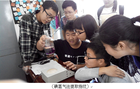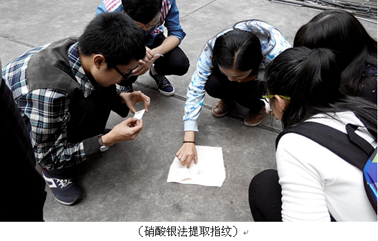 对指纹的类别的简单介绍使同学们对接下来的指纹提取过程充满了期待。随后是对指纹提取方法的介绍和实践环节,同学们一共实践了硝酸银法、碘蒸气法、茚三酮法和异氰丙烯酸乙酯法(即502法)四种方法。在进行指纹提取的同时,王云玲同学还和大家一起探讨了每一种方法的优缺点,提示大家行思结合,践行本社团的创办理念。这四种方法中502法获得的指纹保存期限最长,活动即将结束时,大家小心的在黑卡纸上按下自己的手印,把用异氰丙烯酸乙酯蒸汽显影出来的指纹留为纪念。