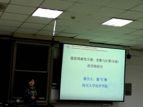 蒲雪梅教授首先进行了自我介绍及其所在课题组的研究领域,接着蒲雪梅教授以分析化学中前沿的研究方法作为切入点,介绍了计算机化学,包括化学数据库,计算机分子模拟方法等方面的内容;之后,蒲雪梅教授就她目前所在负责的三大研究课题,包括蛋白质结构与功能的预测、电致发光材料的分子设计和结构监测以及炸药波普结构解析,并逐个进行讲解分析,介绍了其研究的最新进展情况。