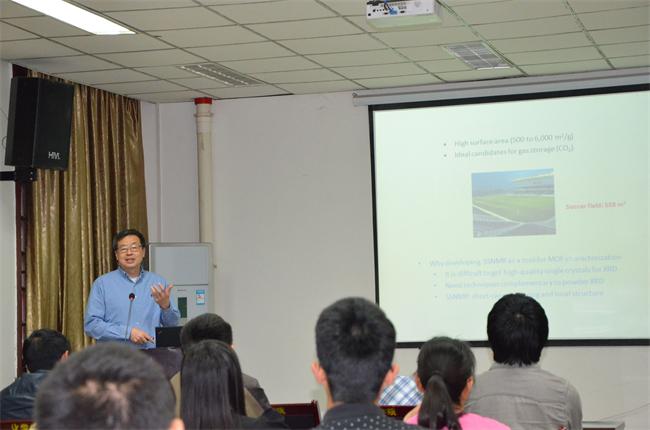 并进行学术交流。在化学馆121报告厅,黄忆宁教授做了题为“Solid-state NMR characterization of metal-organic frameworks at ultrahigh magnetic field”的学术报告。他介绍了该课题组近几年利用固态核磁表征并研究多种金属有机骨架方面的最新研究进展。余孝其院长主持了报告会,林之恩、陶国宏、曾红梅、向海峰等研究人员到场听取了报告。黄教授报告内容新颖,讲解深入浅出,激起了在座老师和同学的浓厚兴趣。报告结束后,黄教授与学院部分师生进行了交流和讨论。