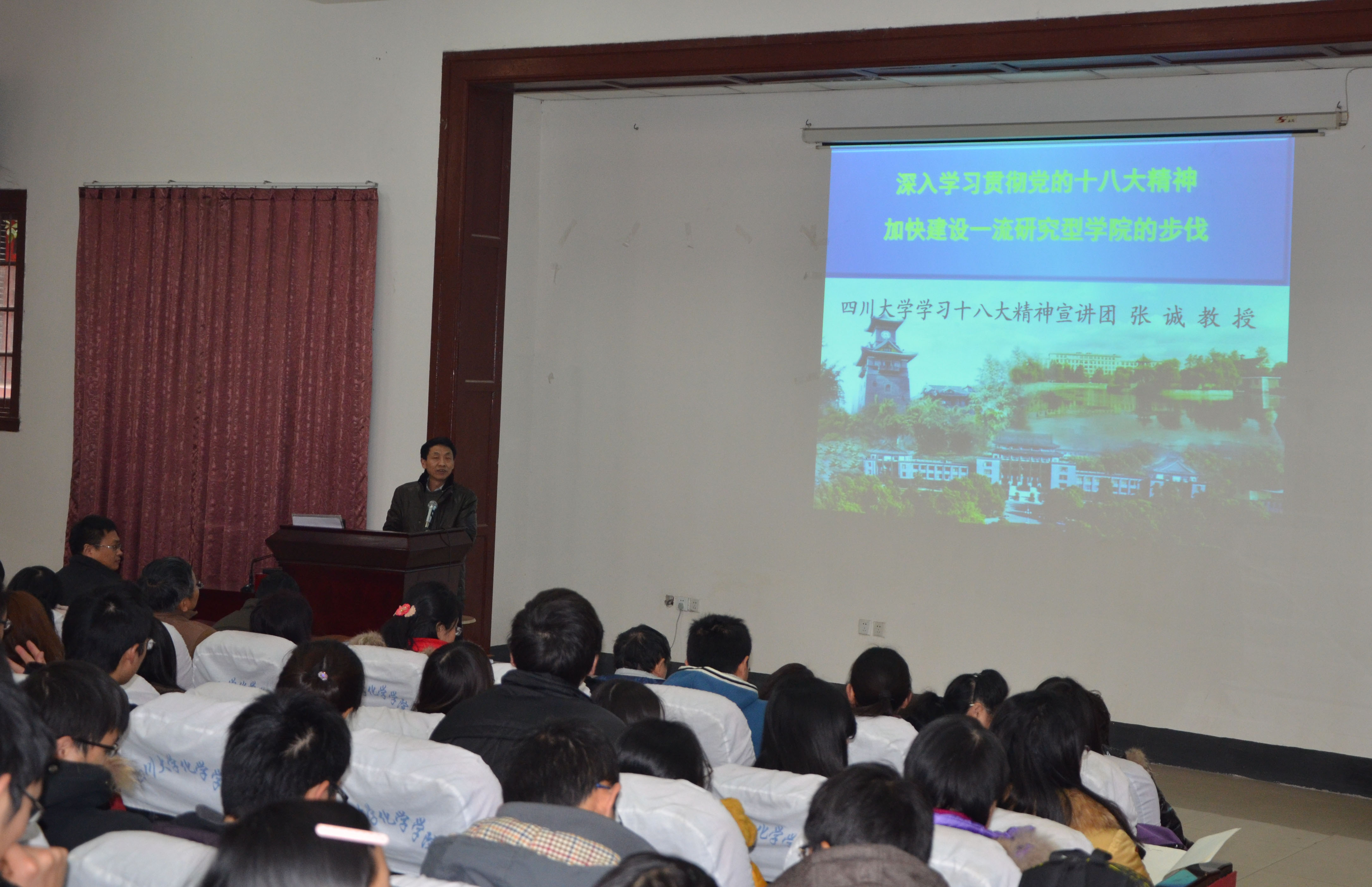 师生作了题为《深入学习贯彻党的十八大精神,加快建设一流研究型学院的步伐》的宣讲报告。报告会由学院党委书记王智猛主持,学院全体领导、党支部书记、教职工党员及部分学生代表参加了此次报告。