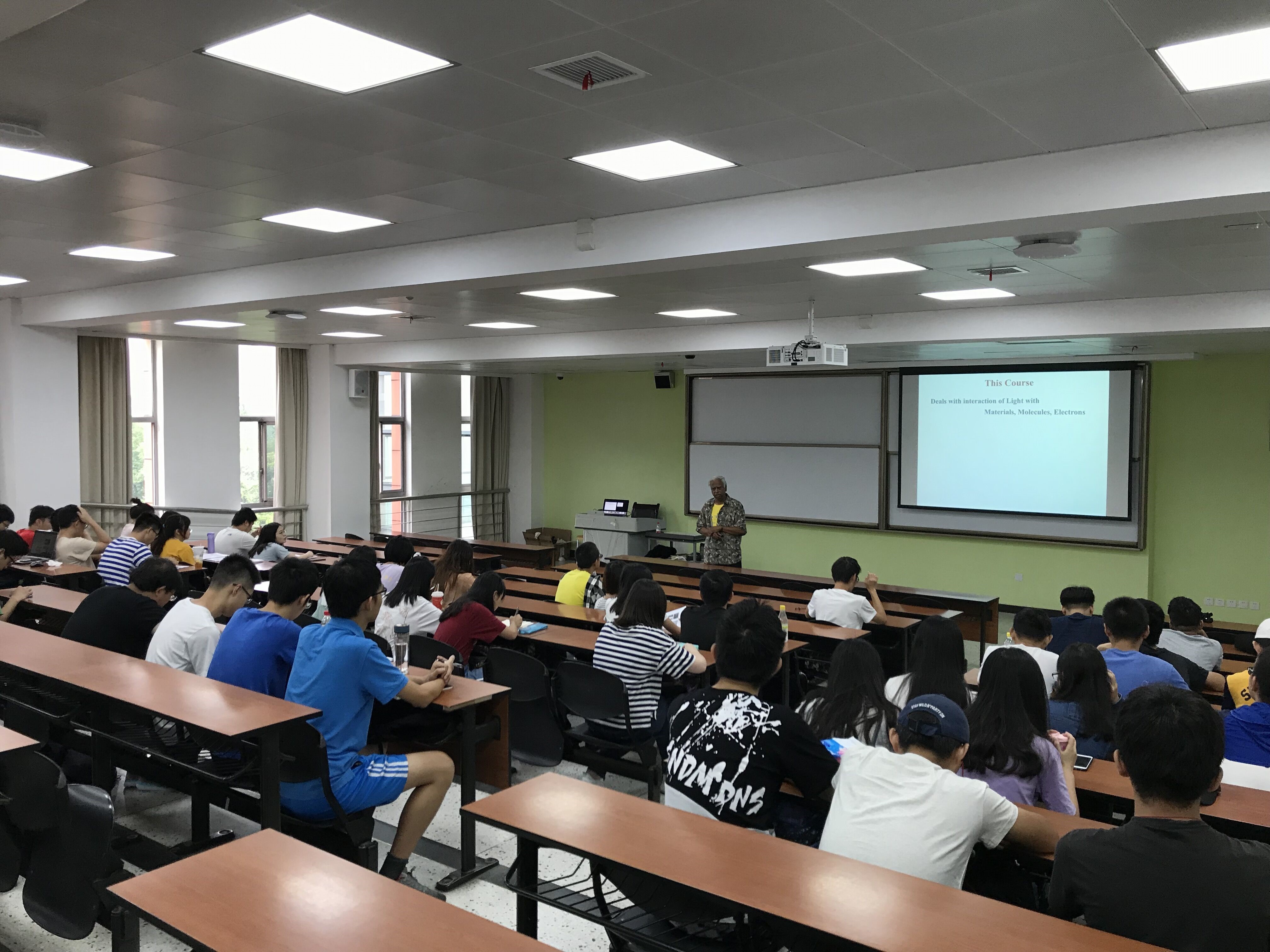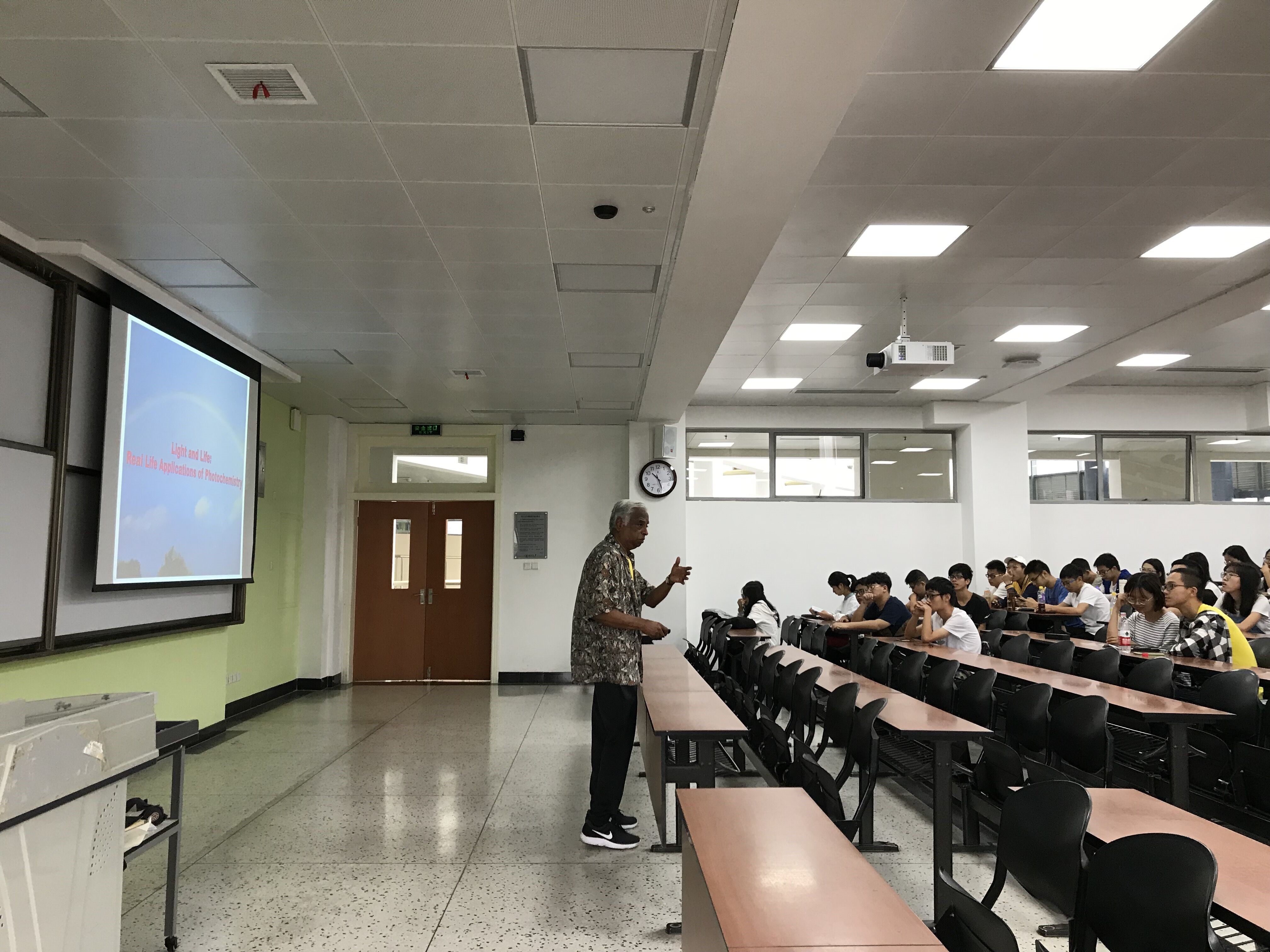Ramamurthy教授从“光与生活”开始,为同学们介绍了光化学的发展进程及前景,让同学们了解了什么是光、什么是光化学,以及光化学在生活中的应用,激发了学生的学习兴趣。接下来,教授为同学们讲解了光化学中一些非常实用的基础知识,如:吸收与发射,发射与辐射,电子转移与能量转移等。总的来说,Ramamurthy教授本次“国际课程周”授课十分圆满,从课堂效果来看,同学们发言积极踊跃;从学习成果来看,同学们收获颇丰。