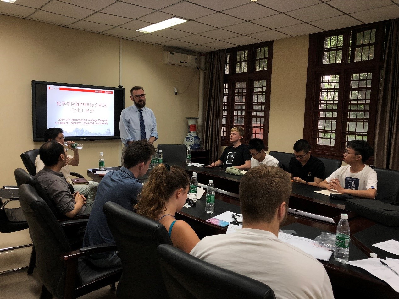 首先,Chruma教授对所有参会师生表示了欢迎,接着中外学生开始了汇报交流:宾正杨副教授指导的英国约克大学的Amy Clayton与Andrew Wrigley同学分享了在实验室制作OLED的理论依据和实验流程,并向大家展示了制作好的器件;接着,余志鹏教授指导的四名中外同学讲述了为期一周的有机及化生实验经历,特别指出余教授课题组先进的仪器大幅提升了实验效率;最后,杨千帆副教授指导的四名中外学生分别与大家分享了这一周所做的生物分析化学相关实验。在三组交流营成员完成科研汇报交流后,Chruma教授鼓励各位同学就本次交流营活动畅所欲言。中外学生均认为这是 一次难忘的经历,他们通过此次交流营不仅收获了化学知识、掌握了化学实验操作技能,还收获了友谊。英国学生对学院组织本次交流营活动及中国学生的日常帮助表示感谢。