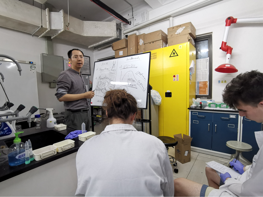 国际交流营参加科研训练活动,与学院2017级两名本科生王曼茜、谭翀云一同进入杨千帆副教授实验室,在杨老师及助教同学的悉心指导下,对分析仪器及其在DNA的定量定性分析的应用上有了初步的了解。
