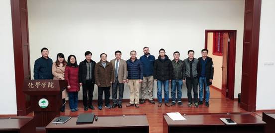 ,并在化学馆321报告厅做了题为“Amino Acid-Based Bifunctional Phosphines for Enantioselective Reactions”的学术报告。卢教授首先介绍了他们基于天然氨基酸设计开发了一类柔性结构的双功能手性有机膦催化剂,随后介绍了他们利用这类优势催化剂在系列不对称催化反应(如环加成,γ-加成,MBH-反应,RC-反应等)中取得的研究进展,该类有机膦催化剂具有标签性的辨识度,同时在 TCI 公司实现了商品化。最后卢教授提出他们接下来将利用这类催化剂及其方法学研究天然产物及手性药物的合成化学。卢教授的报告内容丰富,深入浅出,引起了师生们广泛兴趣。报告后,在场师生与卢一新教授进行了深入的交流和讨论。报告在大家的热烈掌声中落下帷幕,结束后部分老师于卢一新教授合影留念。