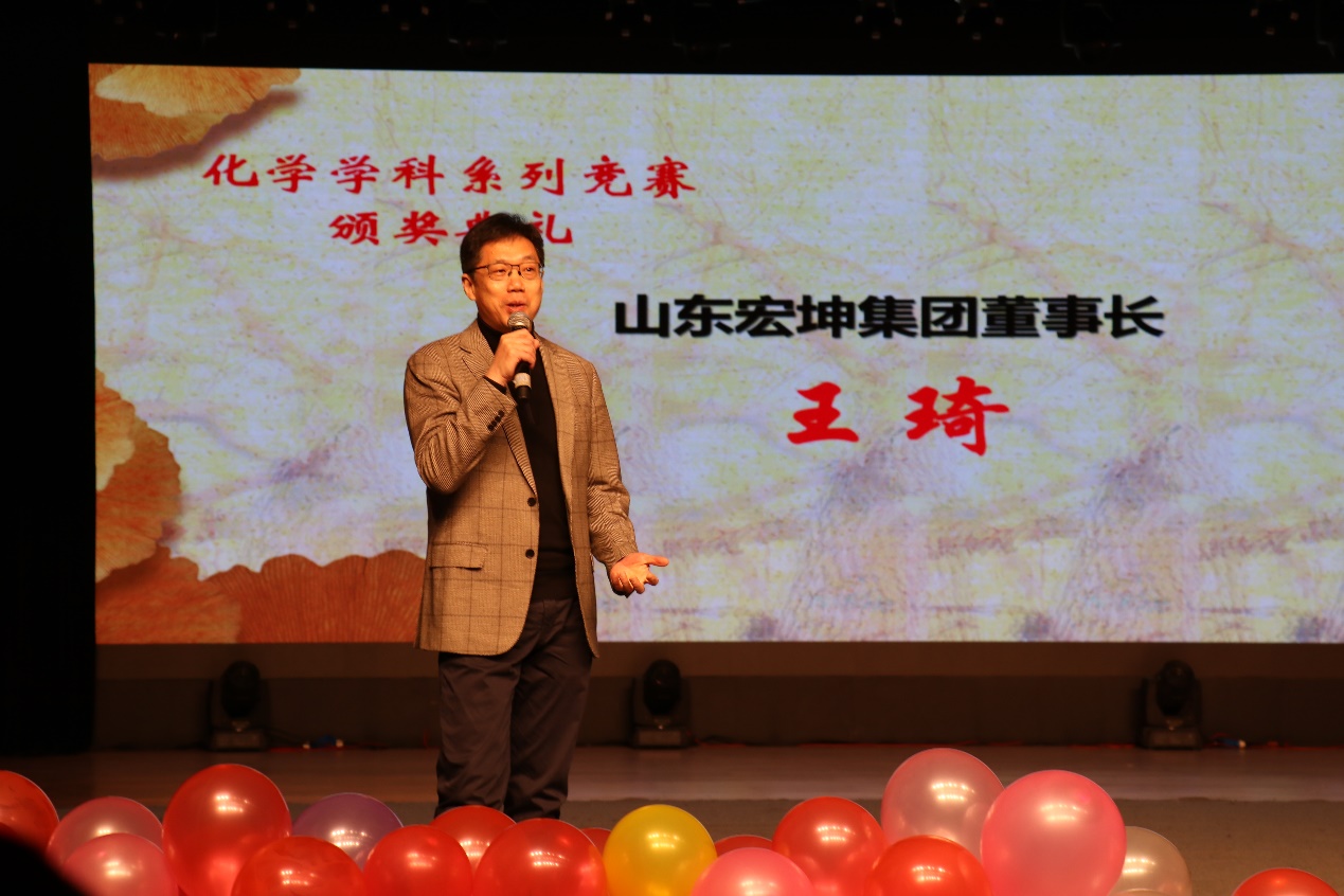 党委书记王智猛先后致辞,对山东宏坤集团和杰出校友王琦先生表示感谢,对获奖同学表示热烈祝贺。王琦先生在致辞中表达了对同学们认真学习知识、提高个人素质、推动社会进步的殷切期望。部分嘉宾为第六届“宏坤·银杏杯”化学知识竞赛和首届全国大学生化学实验创新设计竞赛特等奖获奖选手颁发了奖状。