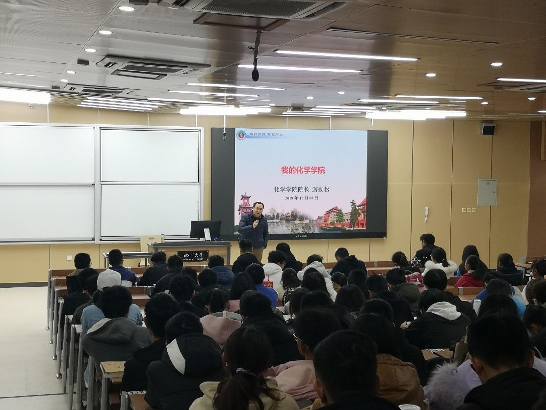 112年的发展历程,介绍了学院学科建设情况和办学条件,强调了化学学科在川大“双一流”建设中的重要地位,展望了未来化学发展的美好前景。游院长着重介绍了学院对学生发展的重视,从培养目标与定位,本科生培养模式,构建“多位一体”的学生思想政治教育体系和学生资助体系,基于科研引导的创新人才培养体系和化学类拔尖人才的国际化培养模式等方面,讲述了性视频