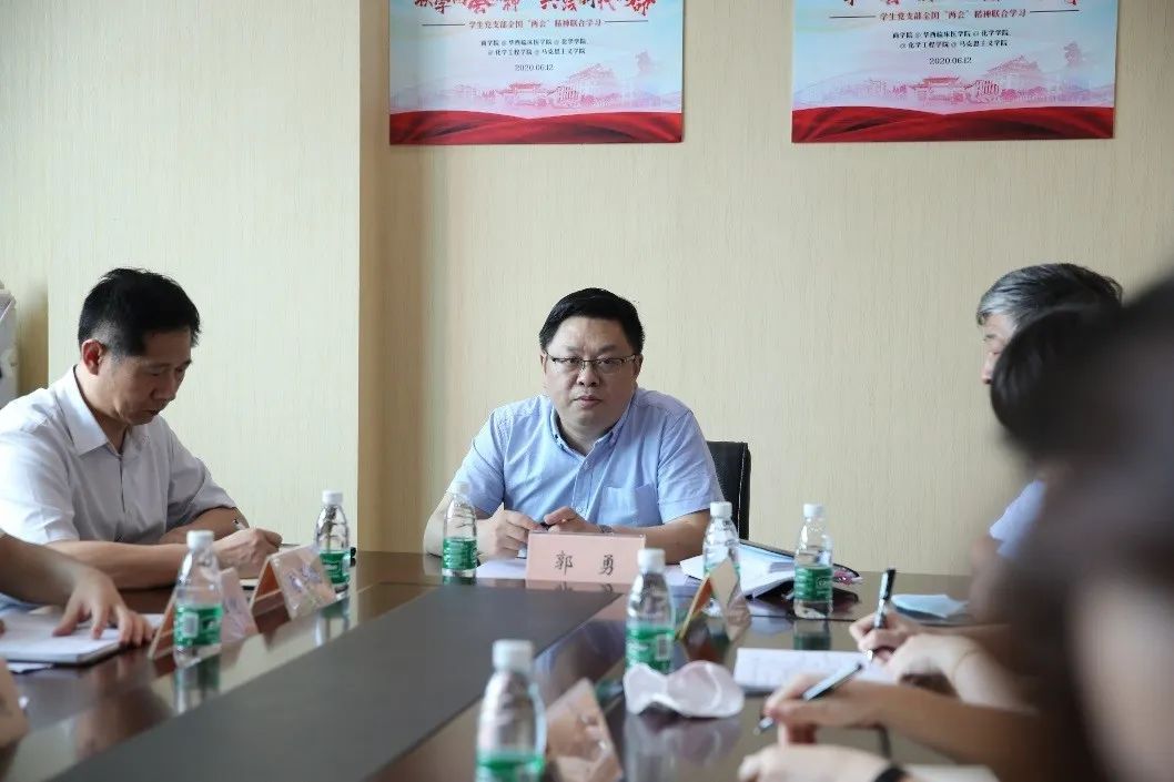在分组交流环节,五个学院的参会师生党员分组开展了“青年与‘两会’座谈交流会”。在“线下”会场,郭勇副书记听取了参会师生党员学习全国“两会”精神的发言后,结合学校的疫情防控、思想政治教育、深造就业、心理辅导、社会实践等方面的工作与参会师生进行了深入讨论。