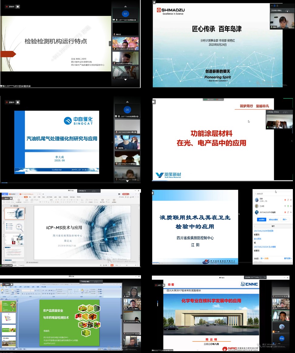 学院邀请了来自四川省林业科学研究院吴斌高级工程师,岛津企业管理(中国)有限公司侯艳红博士,中自环保科技股份有限公司李大成高级工程师,中国核动力研究院第一研究所陈云明研究员,四川省疾病预防控制中心周定友主任技师、江阳主管技师,四川羽玺新材料股份有限公司许显成高级工程师,分别从各自专业角度出发为同学们带来了精彩纷呈讲座。讲座内容涵盖检验检测机构运行特点及常见农残检测技术、岛津仪器介绍和未来发展趋势、汽油机催化剂研究与应用、化学专业在核工业的应用、电感耦合等离子体质谱仪在饮用水检测中的应用、液质联用技术在卫生检验中的应用、功能涂层材料在光电产品中的应用、农产品质量安全控制与农药残留检测技术。