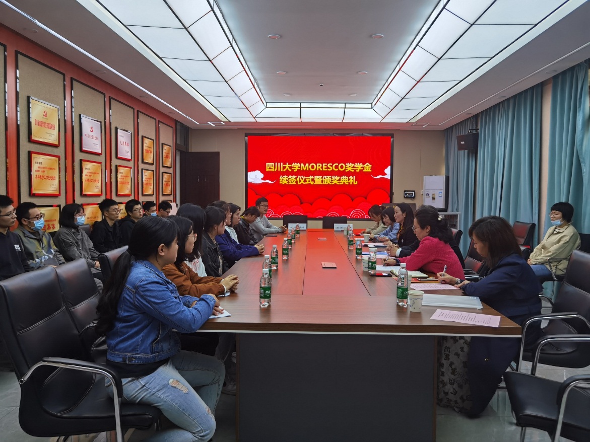 “MORESCO奖学金”续签仪式暨2019-2020学年度颁奖典礼在化学馆122会议室隆重举行。无锡莫莱斯柯贸易有限公司董事长兼日本株式会社MORESCO执行役员刘英进先生、无锡德松科技有限公司研发经理杨帆女士、性视频