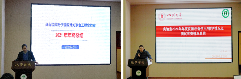 随后,实验室主任王玉忠院士对实验室2021年在师资队伍与平台建设、教学与学生培养、科研与社会服务、国际合作与交流、学术活动等各方面的工作进行了总结, 并对大家一年来所付出的努力和取得的成绩予以肯定。2021年度实验室有4位教师晋升了职称(赵泽永高级实验师、刘博文特聘研究员、付腾特聘研究员、陈琳特聘研究员),2位青年教师入选国家级青年人才工程(赵海波教授、张帆教授),2位老师入选四川省学术带头人后备人选(宋飞教授、赵海波教授)。2021年度实验室获批国家级项目9项,包括国家重点研发计划项目2项、国家自然科学基金重点类项目1项、国家自然基金委优青和海外优青各1项、面上项目1项、青年科学基金2项和中国博士后科学基金面上项目1项;签定国外内外企业委托项目和成果转化项目合同金额超过1亿元;当年到校经费额占性视频