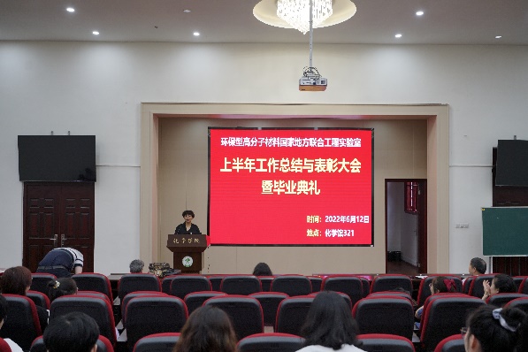 环保高分子实验室上半年工作总结与表彰大会暨2022届毕业典礼在化学馆321报告厅隆重举行。会议由实验室党支部书记汪秀丽老师主持。
