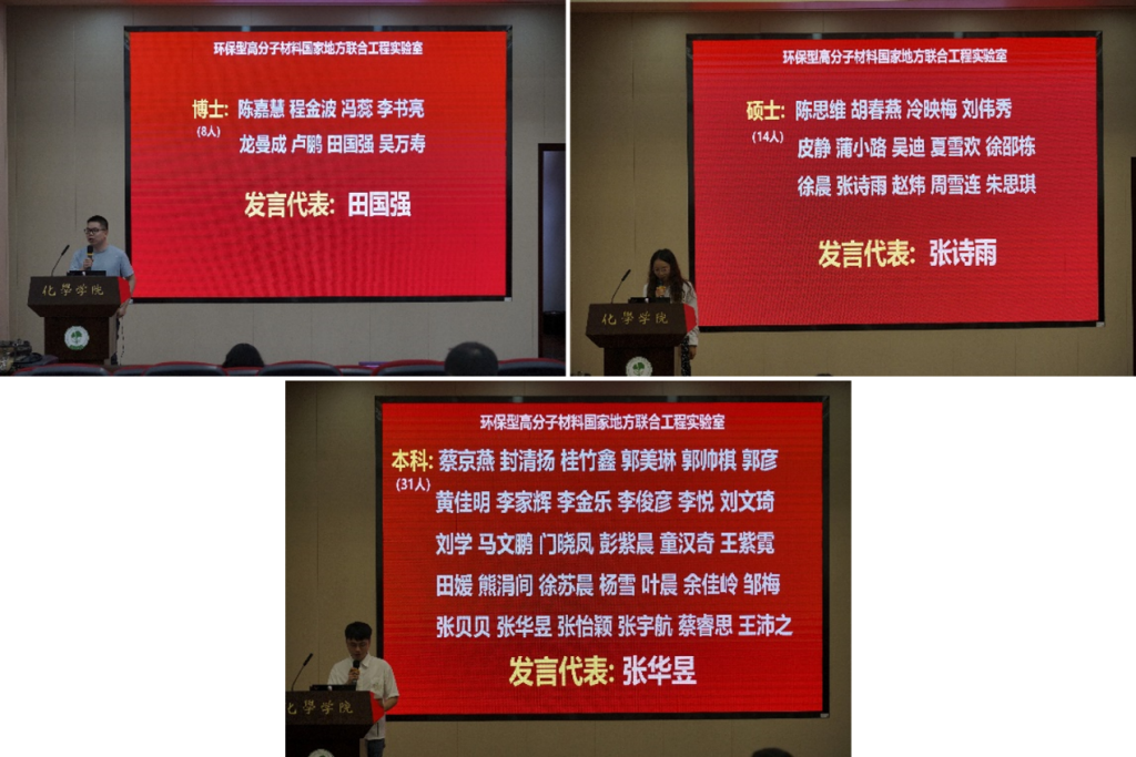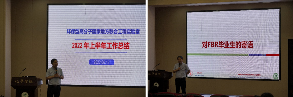 随后,实验室主任王玉忠老师对实验室上半年所取得的各项成绩进行了总结,分别从研究生和本科生培养、科研立项与科研工作进展、社会服务等几个方面具体分析和总结了截止到5月底的相关情况,对实验室上半年的工作表示肯定,同时鼓励大家再接再励。王老师对即将踏上新征程的毕业生们寄予深切的祝愿,希望同学们要有大的格局和广阔的视野,在今后的学习和工作中不断努力,积极进取,将环保高分子实验室精神发扬光大,始终把优秀当作一种习惯,成为国家的栋梁之材。