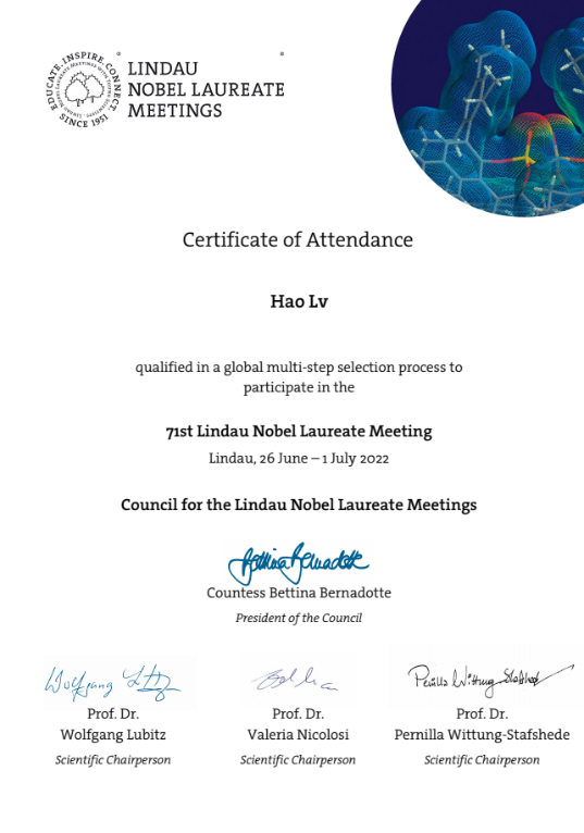 2020级博士研究生吕浩通过层层选拔,从全国众多知名高校的158名优秀博士生和青年学者候选人中脱颖而出,作为国内最终获得参会资格的30名博士生之一,与30位诺奖得主和来自90个不同国家地区近500位优秀的青年学者们共赴学术盛宴,探讨化学领域科研最新进展。