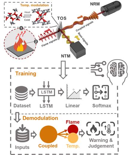 为此,课题组制备一种二氧化钒基火灾探测材料,结合近红外光发射和接收模块,构建了可用早期火灾的探测装置,并协同长短期记忆循环神经网络算法同步解调耦合信号,实现环境异常温度/明火的快速识别与火灾成因准确判定。