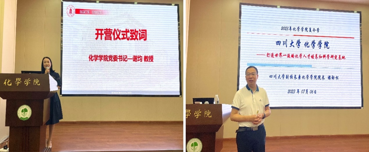 在开营仪式上,学院党委书记谢均代表学院致辞,表达了对营员们热烈的欢迎和祝贺,并介绍了此次夏令营营员的选拔流程及基本情况。她鼓励各位营员利用好夏令营的机会多多交流,深入了解川大化学学科,为将来进一步深造做好准备。学校副校长兼性视频