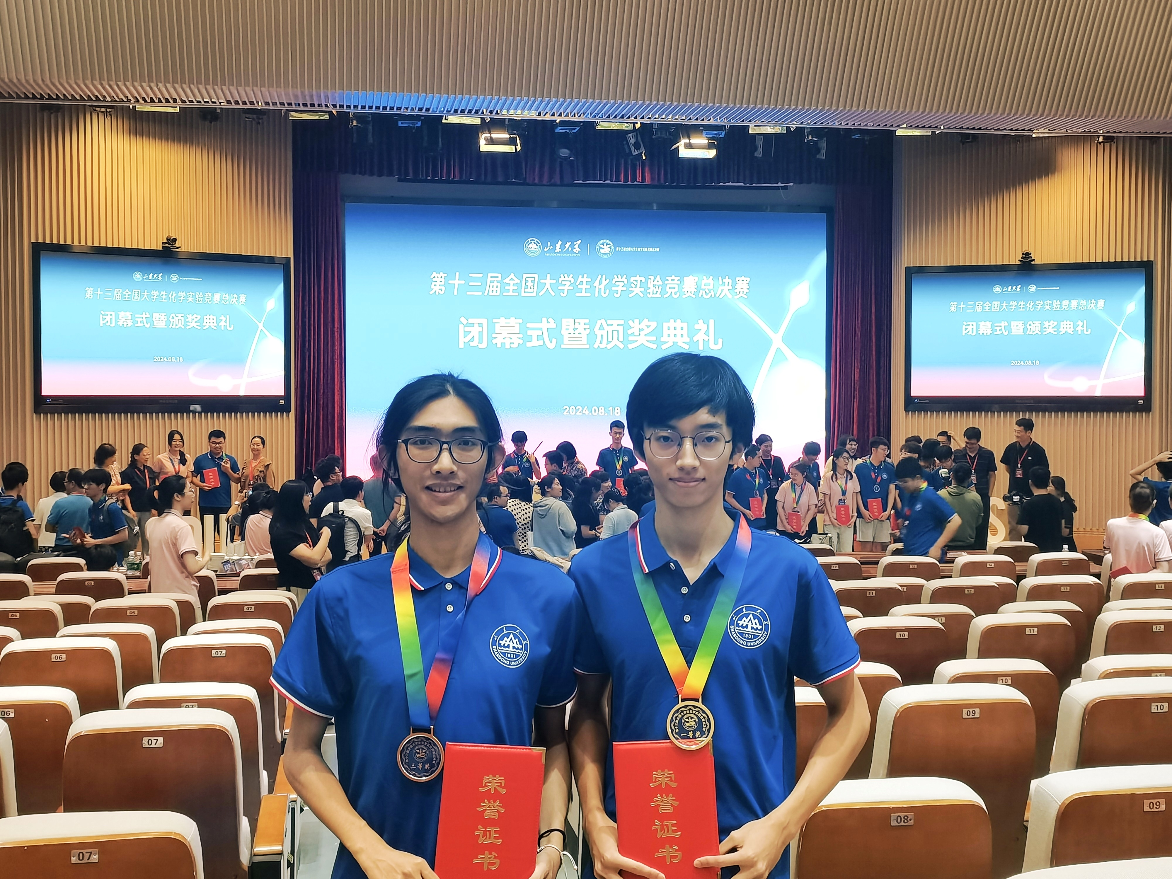 2021级本科生李曦、赵伟屹两位同学参加了此次全国总决赛,和来自全国各类高校的化学学子同台竞技,充分展示了扎实的化学理论知识和熟练的实验操作技能,表现优异,分别荣获了全国总决赛一等奖、三等奖。