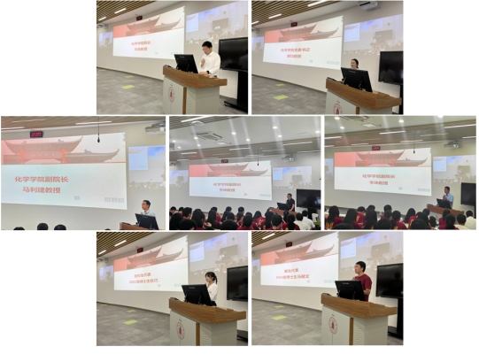 马利建副院长强调了科研创新性的重要性,寄语同学们要继承和发扬学院优良的学术传统,勇于创新,敢于攀登科学高峰,为化学事业的发展贡献自己的力量。李峰副院长告诉同学们科研的发展不是线型的,而是指数型的,前期要敢于坐冷板凳,面对不顺利千万别气馁。更要寻找科研的乐趣,提高效率,降低预期,快乐值就会更高。李坤副院长强调科研工作中实验安全的重要性,尤其是化学药品的购买、储存和使用,强调了安全不仅是自己更是大家的,平平安安入学,健健康康毕业。