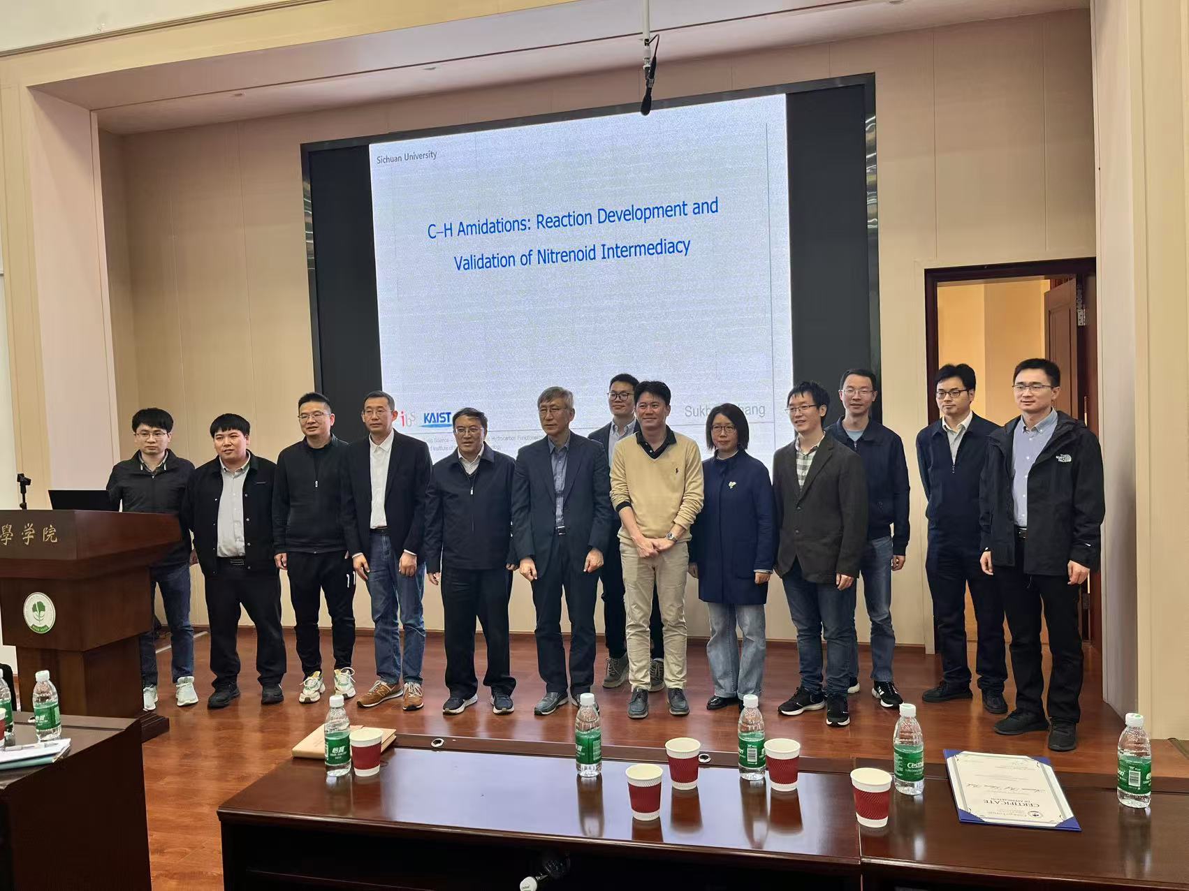 冯小明院士主持,并为Sukbok Chang教授、Sehoon Park副教授颁发荣誉证书和赠送蜀锦。刘小华教授、曾小明教授、余达刚教授、郑柯教授、董顺喜教授、夏莹教授、谭光映教授、曹伟地教授、蒲茂坪副教授、周宇乔副教授等老师及学生参加了报告会。