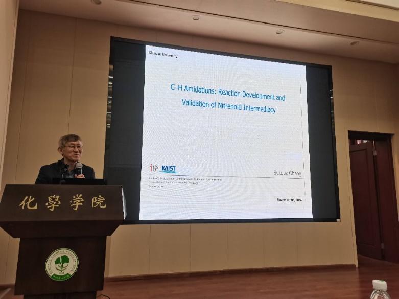 Sukbok Chang教授作了题为“C-H Amidation via Metal Nitrenoid Transfer: Reaction Development and Validation of Nitrene Intermediates”的报告,首先集中展示了目前在金属氮宾介导的碳氢胺化反应领域的最新研究进展,利用铱催化剂促进二噁唑酮的分解,形成高活性的金属氮宾中间体,进而通过外球机理实现C-H插入反应,并且成功实现了不对称版本的。接着,他还探讨了钴催化剂在这一类反应中的应用潜力。此外,还详细介绍了通过理性设计底物,结合机理实验、光解晶体学和计算研究等手段,实现了对金属氮宾中间体深入的表征研究。