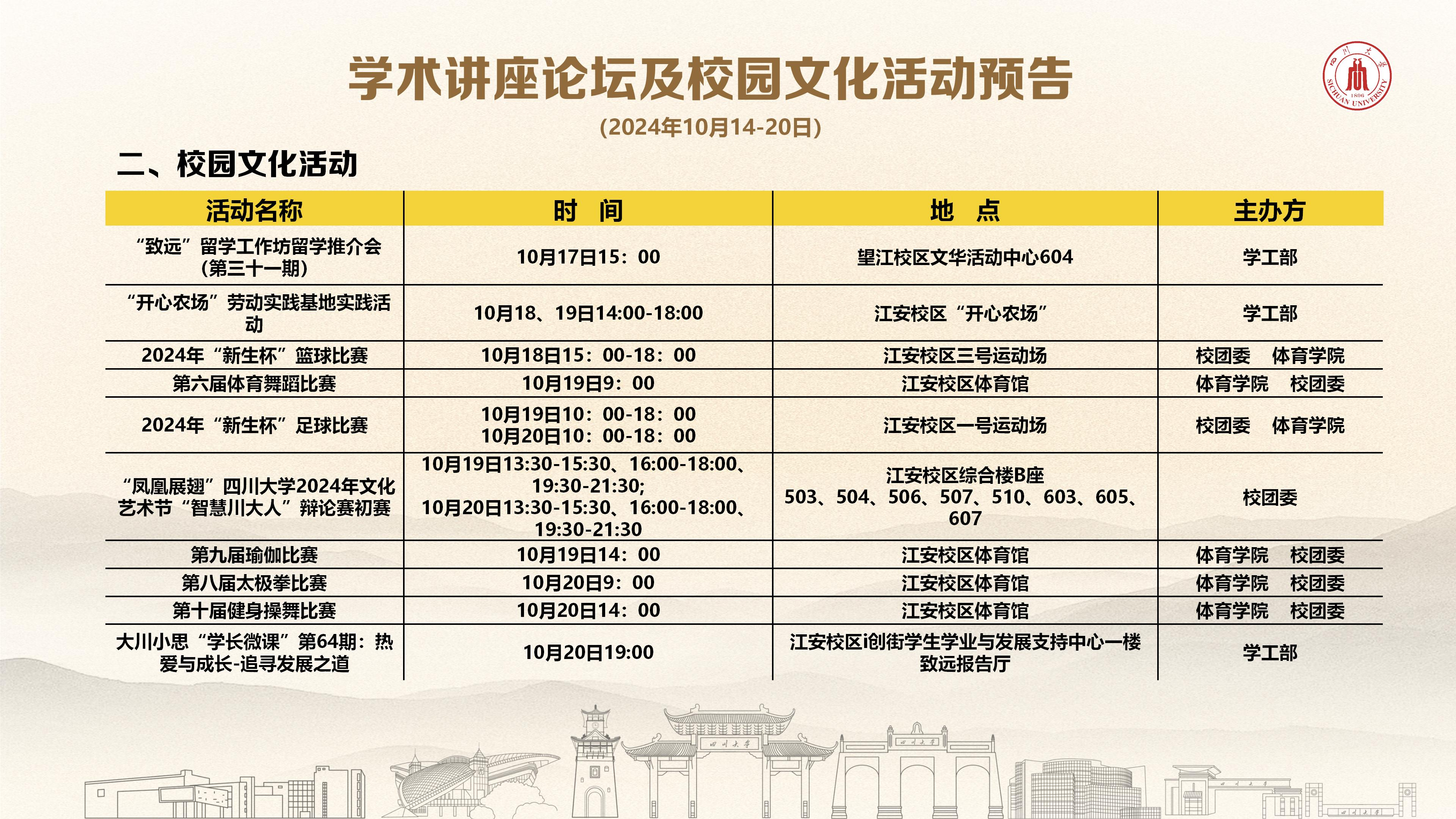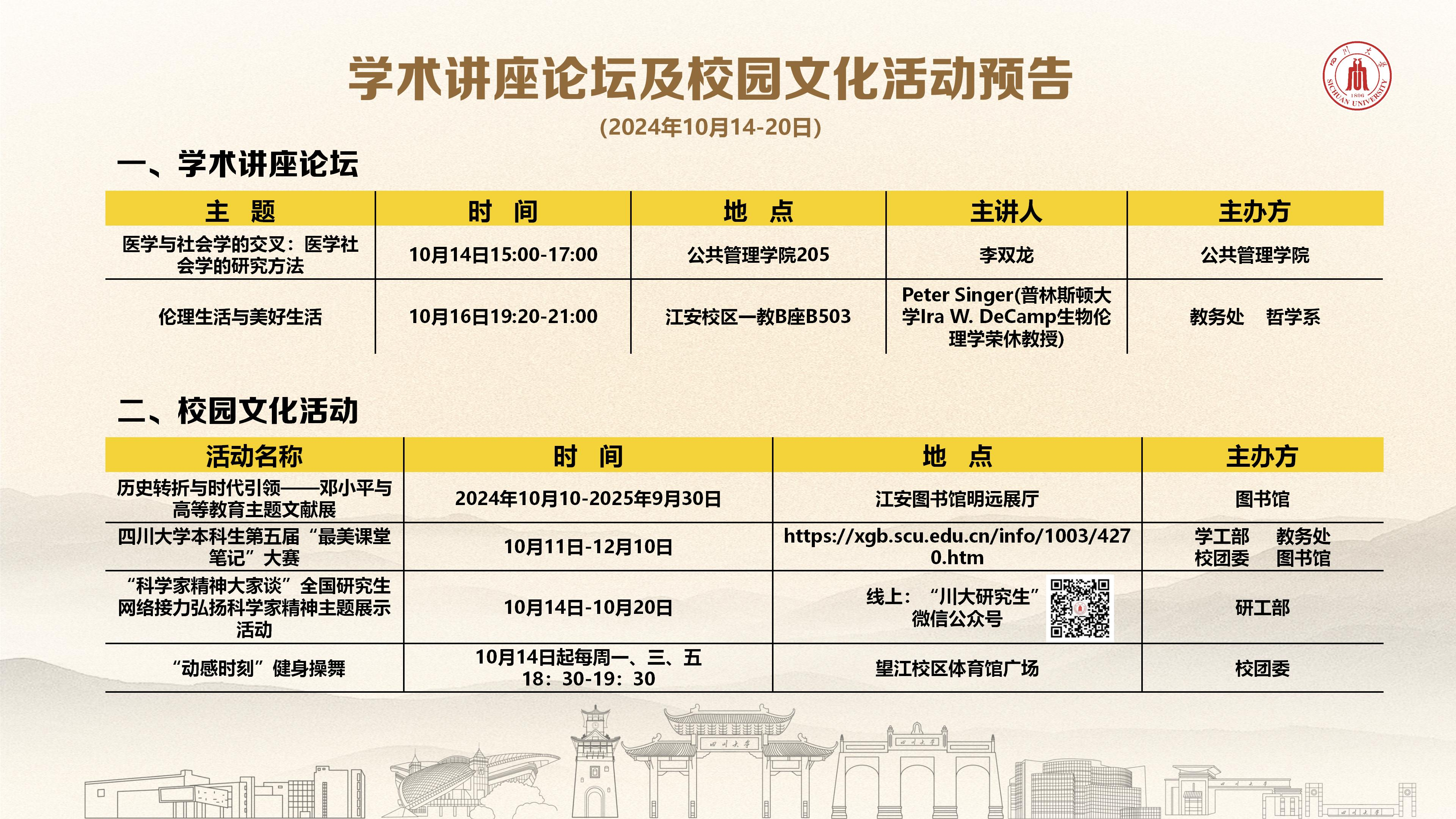 学术讲座论坛及校园文化活动预告(2024年10月14日-20日)