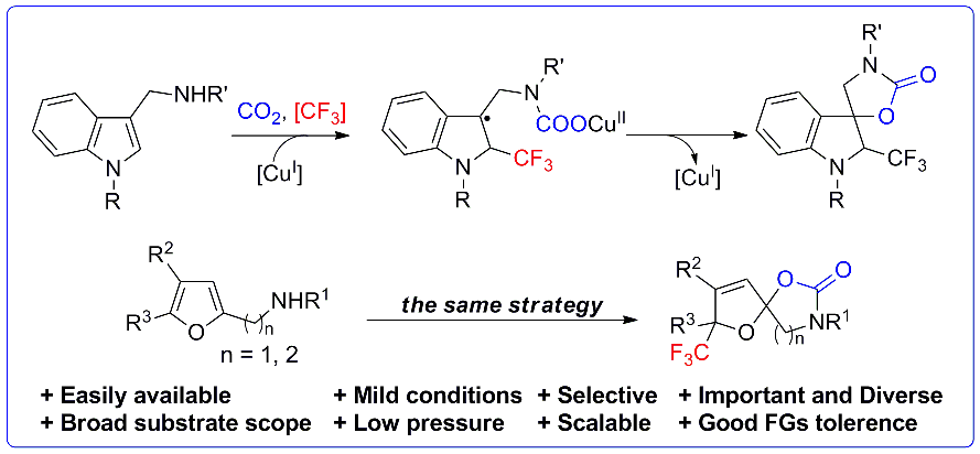 针对碳氢键氧化羰基化反应中存在的问题(需要使用剧毒的CO和当量的氧化剂),我们首次提出“CO2 = CO + [O]”理念,利用CO2代替CO和氧化剂参与碳氢键羰基化反应,发展了近十类重要含羰基杂环类化合物的高效合成方法,提出了新反应机制,不仅变废为宝,还降低成本,提高安全性,具有较强的实用性;基于过渡金属催化和可见光催化策略,我们发展了“自由基型CO2转化”模式,一方面通过调控自由基参与不饱和烃转化反应的选择性,在室温常压下实现了噁唑啉酮和多种类型羧酸的高效制备,另一方面基于“可见光促进单电子活化”策略和电还原策略,通过单电子还原CO2或底物形成自由基负离子,实现了具有独特区域选择性的烯烃羧基化反应以及氮杂芳烃区域选择性可调控的羧基化反应;基于极性翻转策略,我们通过惰性化学键(如碳氟键碳氮键和碳氧键)的选择性断裂实现了CO2参与的羧基化反应;此外,我们实现了铜或镍催化CO2参与的不饱和烃碳碳成键反应,取得了优秀的对映选择性、化学选择性、区域选择性和Z/E选择性,高效构建了具有手性(季碳)中心的高苄醇高烯丙醇和羧酸。这些工作实现了CO2的变废为宝和高附加值产品的精准合成,为研究CO2活化的本质和规律提供了新的实验基础和理论模型,为促进我国CO2化学研究起了积极的作用。
