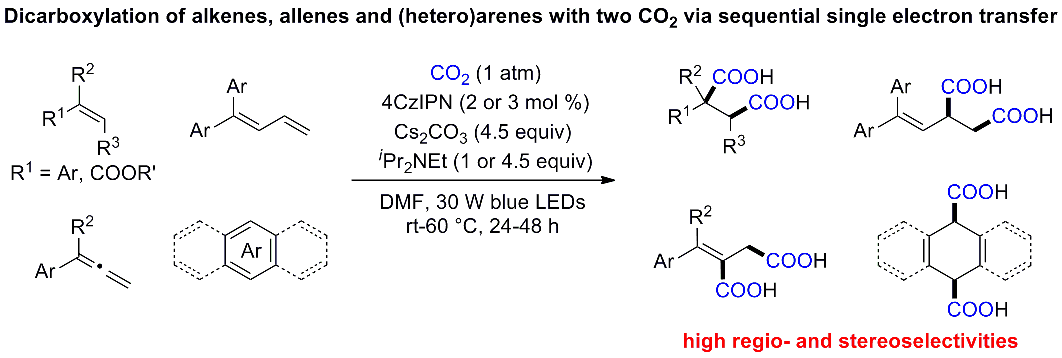 68.T. Ju, Y.-Q. Zhou, K.-G. Cao, Q. Fu, J.-H. Ye, G.-Q. Sun, X.-F. Liu, L. Chen, L.-L. Liao, D.-G. Yu*, Dicarboxylation of alkenes, allenes, and (hetero)arenes with CO2 via visible-light photoredox catalysis. Nat. Catal. 2021, 4, 304–311.