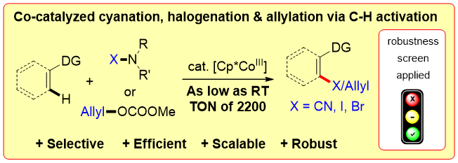 123.D.-G. Yu, T. Gensch, F. de Azambuja, S. Vásquez-Céspedes, F. Glorius*, Co(III)-Catalyzed C–H Activation/Formal SN-type Reactions: Selective and Efficient Cyanation, Halogenation, and Allylation. J. Am. Chem. Soc. 2014, 136, 17722. (Top 3 most read JACS papers in December, 2014).
