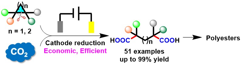 57.L.-L. Liao, Z.-H. Wang, K.-G. Cao, G.-Q. Sun, W. Zhang, C.-K. Ran, Y. Li, L. Chen, G.-M. Cao, D.-G. Yu*, Electrochemical Ring-Opening Dicarboxylation of Strained Carbon-Carbon Single Bonds with CO2: Facile Synthesis of Diacids and Derivatization into Polyesters. J. Am. Chem. Soc. 2022, 144, 2062.