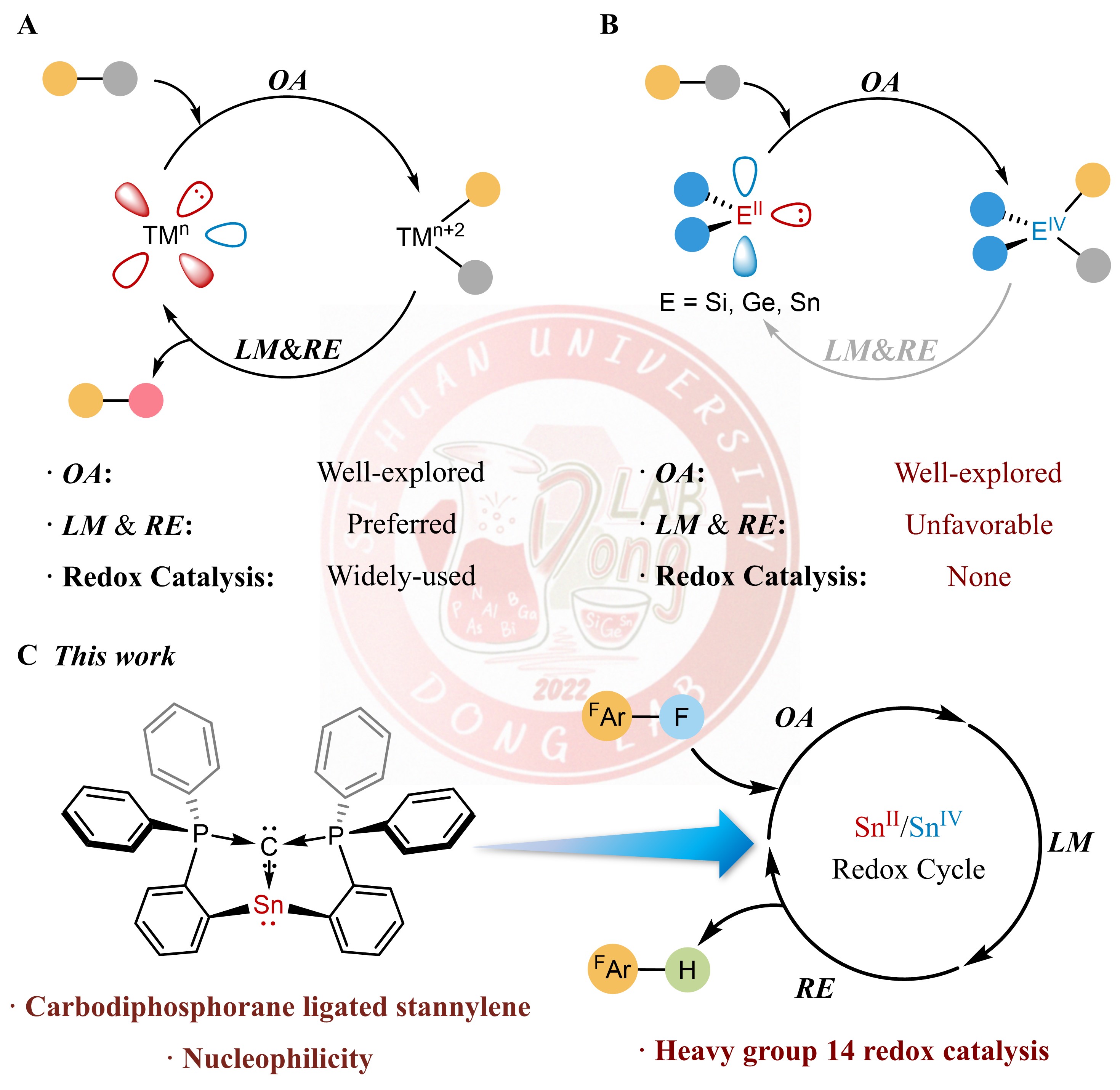 近年来,具有准金属特性的主族元素催化已发展成为有机催化领域的重要前沿方向,其通过利用地球储量丰富、环境友好的主族元素模拟过渡金属的催化行为,为发展绿色、可持续的合成化学提供了新范式。课题组研究工作聚焦于具有准金属特性的低价重十四族元素试剂的精准合成与催化性能,围绕"低价锗、锡试剂的高效创制与功能调控"这一关键科学问题,通过创新配体设计与合成策略,系统开展相关催化体系的构建与反应机制研究。
