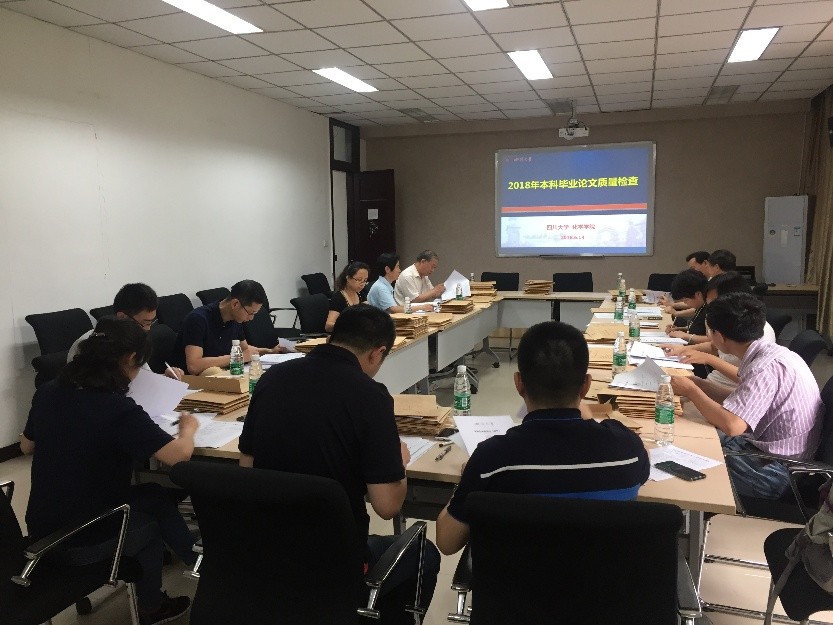 为扎实推进本科毕业论文质量工程,学院本年度下大力气开展审查工作,依次通过形式审查——复查——专项检查——定向整改四个环节,切实将本科毕业论文质量放在首位。6月14日下午,各教研室教师代表和学院督导组老师共同对2018届本科毕业论文进行了论文质量检查工作。郑成斌副院长组织了本次毕业论文质量检查工作。学院分别从毕业论文套表填写的规范性、本科毕业论文的格式、撰写质量、外文翻译情况和工作饱满度等方面展开。经过十余位老师的认真核查,大部分同学的本科毕业论文工作量饱满,表格填写规范,符合学校本科毕业论文规定和要求,但有46名同学的毕业论文仍存在不同程度的问题,需要进一步完善,学院及时通知相关同学和指导教师限期整改。2018届本科毕业论文共有218名同学通过了答辩。