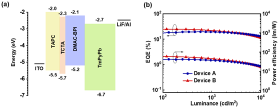 图2. DMAC-BPI的非掺杂OLED器件结构及效率随亮度变化曲线