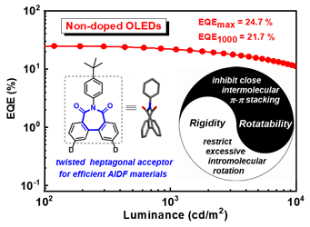 游劲松团队最近在非掺杂OLED器件中取得了突破性进展,发展了一种基于扭曲七元环二酰亚胺受体的聚集诱导延迟荧光材料(AIDF),实现了最优性能的非掺杂OLED器件。