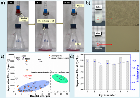 利用绿色溶剂NMP与树脂的相亲性,在微波加热条件下对废旧环氧树脂(EP)溶胀得到溶胀树脂(SEP),随后经过微波辅助制孔得到结构稳定的多孔树脂(PEP),PEP孔径均匀分布在80 nm左右。改性后树脂表面粗糙度从1.8 nm增加到63.1 nm,水接触角从81o增加到101o(图2)。微波促溶胀致孔法是一种物理改性方法,回收过程没有破坏树脂的三维网络结构,因此在保持热固性树脂良好的热稳定性和机械稳定性基础上可应用于油水分离领域。在无需外加压力条件下,PEP依靠油水混合自身重力可实现对油水乳液的高效分离,对粒径为3.5 μm的乳液分离通量达到2306.78 L (m2 h)-1,且多次循环使用后,PEP仍保持很高的分离效率和分离通量。通过改变溶胀溶剂的组成和配比可以调控树脂的孔径,可高效分离不同粒径的乳液,当乳液粒径与多孔树脂的孔径大小相当时,PEP的破乳效果最佳(图3)。此外,微波促溶胀致孔法还适用于环氧树脂复合废料以及其他热固性树脂的回收利用。