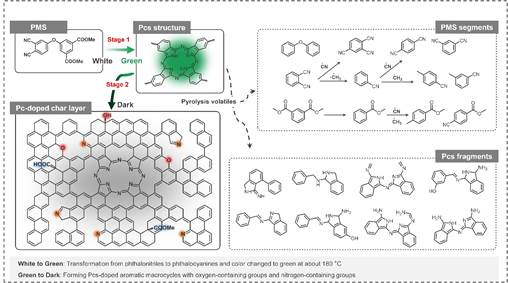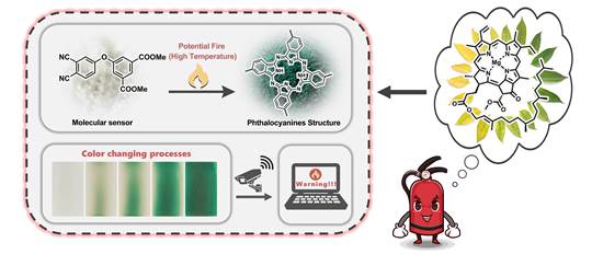 研究发现,在约180 °C时,部分PMS发生化学结构变化并形成酞菁环,PMS的颜色从白色变为绿色;而在更高的温度下,部分PMS会形成氮掺杂的炭,颜色从绿色变为黑色。PMS从白色变成绿色的温度(180 °C)远高于室温,且低于大多数化合物(化学品,木材,聚合物材料等)的自燃温度。PMS分子传感器在正常应用温度下稳定,但会引发火灾的异常高温下发生智能变色,释放变色传感信号,这一特性赋予了PMS火灾探测预警功能。