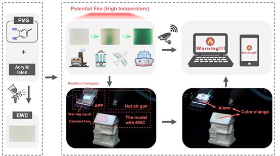 王玉忠院士团队一直致力于研发安全可靠的阻燃材料及先进智能的火灾探测预警技术以解决火灾安全难题。最近,该团队受到自然界中的植物叶绿素的代谢和其分子结构的启发,设计了可在潜在火灾的高温下发生智能变色,释放颜色变化信号的分子传感器(Precursor Molecular Sensor,PMS),并制备了火灾探测预警器件,通过智能变色传感器与图像识别技术的交叉融合,发展了一种具有火情可视化功能,可防火于未燃的实时在线极早期潜在火灾和早期火灾的探测预警技术,可实现20 s内潜在火灾高温响应报警(275°C)和3 s内明火预警(预警技术示意图如图1所示)。
