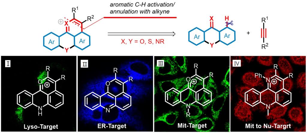 摘要: 游劲松课题组利用C=X (X = N, O, S, N-R)与炔烃的氧化环化反应,高效构建含杂原子的多环芳烃荧光分子库。通过调节氮原子的化学环境实现了不同类型分子能分别对溶酶体、内质网、线粒体以及线粒体-细胞核进行特异性标记,展示了碳氢键活化在开发有机功能材料中的魅力。