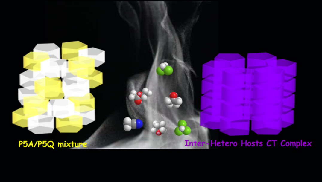杨成课题组在异质主体CT复合物的形成和形态控制方向取得重要进展。发现具有富电子空腔的全甲基化柱[5]芳烃(P5A)与缺电子空腔的全氧化产物柱[5]醌(P5Q)之间能够形成异质主体CT晶体。通过扫描电子显微镜(SEM)、粉末X射线衍射(PXRD)、氢谱、热重和X射线单晶衍射等多种手段证实,该微晶的形成除了源于CT相互作用外,大环主体分子对溶剂的包结作用起到了至关重要的作用,溶剂分子作为桥梁在控制晶体成核和生长过程、决定所得材料的形态特性等方面起到重要的“胶水”作用。研究表明,实验室不同有机溶剂的蒸汽对能否诱导P5A/P5Q固体粉末形成CT微晶、着色程度、着色时间以及所形成的CT峰的紫外吸收强度(ICT)与吸收波长均存在显著差异,从而发展了一种区分实验室不同有机溶剂的快速、简便及可视化方法,解决了实验室常用的有机溶剂因其无色、具有挥发性且化学惰性,不借助分析仪器难以直接区分的难题。