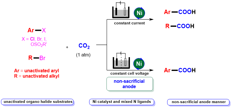 总的来说,该研究利用温室气体CO2作为羧基源,通过电化学发展了一种镍催化的非活化芳基和烷基(类)卤代物的羧基化新方法,并开发了一种实现该反应的非牺牲阳极体系,具有条件温和、成本低、底物适应性广和官能团兼容性高等优点,为重要羧酸化合物的制备提供了新途径。