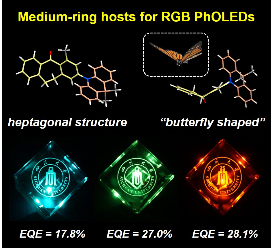 该工作中发展的柔性亚乙基连接的二苯并环庚酮受体不仅具有非环结构的可旋转性(柔性),可以减小分子间紧密堆积造成的激子淬灭,而且也具有环状结构的刚性,能抑制因分子内过度旋转造成的非辐射跃迁。通过与甲基咔唑相连制备得到双极性主体材料,其展现出非常平衡的载流子传输特性和良好的光物理和热稳定性,是实现高效率和低效率滚降OLED器件的关键。