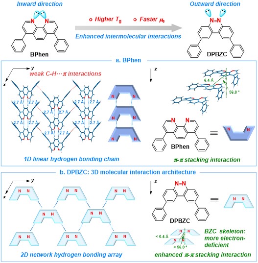 游劲松教授、宾正杨副研究员团队通过对广泛使用的电子传输材料4,7-二苯基-1,10-邻菲啰啉(BPhen)的单晶结构进行深入分析,揭示了其存在较弱的分子间C−H×××p相互作用,可能促使分子滑动而产生聚集现象,最终导致材料较低的Tg值(62 ℃)。据此,课题组提出了“三维分子相互作用”策略来改善材料的Tg值。作者将1,10-邻菲啰啉骨架中的分散的两个氮原子聚集,一方面增强其缺电性,降低最低未占据轨道能级,有利于提高电子的注入效率;另一方面,两个氮原子的孤对电子由向内转变为向外朝向,有利于增强分子间氢键相互作用。因此,作者设计了一类非传统的苯并噌啉结构,并以铑催化的氧化C−H/C−H自偶联反应为关键步骤,成功构筑了以苯并噌啉为母核的新型电子传输材料2,9-二苯基苯并噌啉(DPBZC)。单晶结构显示其存在高度有序的三维分子相互作用,包含二维网状氢键相互作用和一维p-p相互作用。在x-和y-轴方向,DPBZC的氢键长度略短于BPhen的氢键长度,因此DPBZC拥有比BPhen更强的分子间氢键相互作用;在z-轴方向,DPBZC展现出面对面的堆积模式,拥有比BPhen更强的分子间p-p相互作用。因此,高度有序的三维分子相互作用赋予了DPBZC极高的Tg值,其达到218 ℃,远高于BPhen等常用电子传输材料,并且也赋予了其较高的μe值,达到6.4 ´ 10-4 cm2/V s。