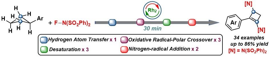 为实现环丁烷的二胺化反应,王元桦课题组通过近些年来发展的双核铑催化的单电子氧化反应,利用市售的N-氟代苯磺酰亚胺 (NFSI)作为氧化剂和非氮宾氮源,成功地在30分钟内实现了芳基环丁烷的C-2,4位的二胺化反应,最高收率可达86%。