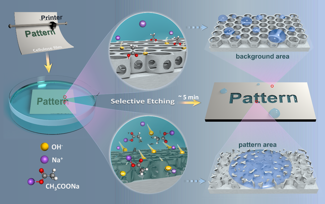 王玉忠院士创建的环保型高分子材料国家地方联合工程实验室,长期从事生物基与生物降解高分子材料的基础与应用研究工作。该团队受可降解高分子材料分解过程因化学和物理结构改变导致材料表面润湿性变化所启发,提出了一种可控限域化学刻蚀策略,仅利用普通商用喷墨打印机即可实现精确、复杂图案化润湿差异表面的简单、快速制备(例如二维码图案)。通过三醋酸纤维素在NaOH水溶液中的脱乙酰降解反应,结合水滴模板法与喷墨打印技术,在三醋酸纤维素多孔表面成功实现差异化碱刻蚀,从而制备了具有本征润湿差异的图案化表面。表面图案区域与非图案区域具有明显润湿差异性,并且表面润湿性与微观形貌可通过控制脱乙酰化程度予以调控。制备的图案化表面在响应型信息存储与加密、柔性电子器件的制备等领域展现出良好的应用前景。