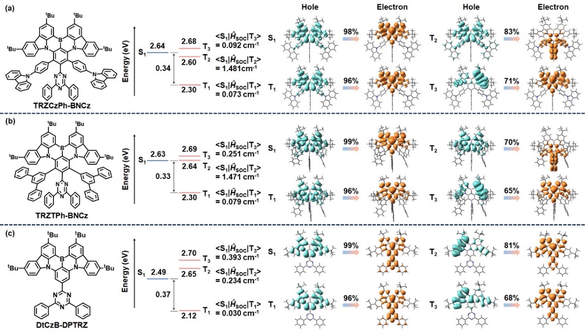 游劲松教授、宾正杨副研究员团队发展了一种基于“空间限制的给受体”策略以提高MR-TADF分子kRISC,在保持较窄发光半峰宽的前提下,成功将MR-TADF分子的kRISC提高至106 s-1。在分子DtCzB-DPTRZ的基础上,基于“空间限制的给受体”策略发展了新型MR-TADF分子TRZCzPh-BNCz和TRZTPh-BNCz。理论计算研究发现,通过引入空间限制的给受体基团,可以降低MR-TADF分子的T2和T3能级,进而使其接近S1能级,从而打开了从中间的T2/T3态到S1态的高效上转换通道。同时,通过引入空间限制的给受体基团,TRZCzPh-BNCz和TRZTPh-BNCz的S1态的跃迁特征与其T2或T3态的跃迁特征有较大的差异,造成其自旋轨道耦合SOCS1-T2和SOCS1-T3相对较大,使得激子从T2或T3态的反系间窜越过程更加高效,最终将kRISC从DtCzB-DPTRZ的103 s-1数量级提升到TRZCzPh-BNCz和TRZTPh-BNCz的106 s-1数量级。