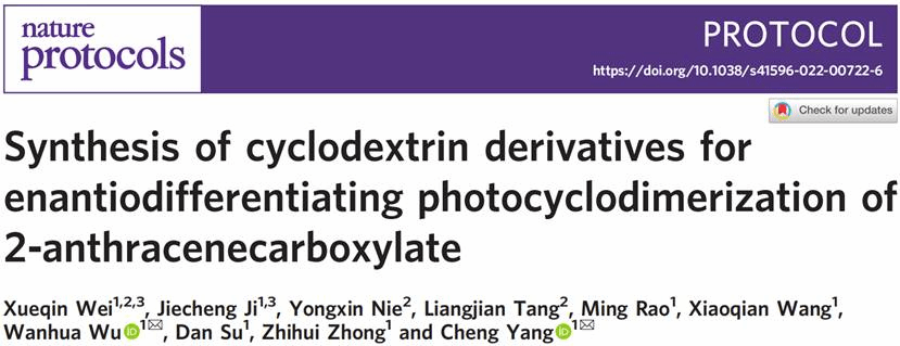 杨成、伍晚花团队在《Nature Protocols》杂志上发表了题为Synthesis of cyclodextrin derivatives for enantiodifferentiating photocyclodimerization of 2-anthracenecarboxylate的论文,报道了环糊精衍生物介导的2-蒽酸手性光二聚反应的设计和研究。