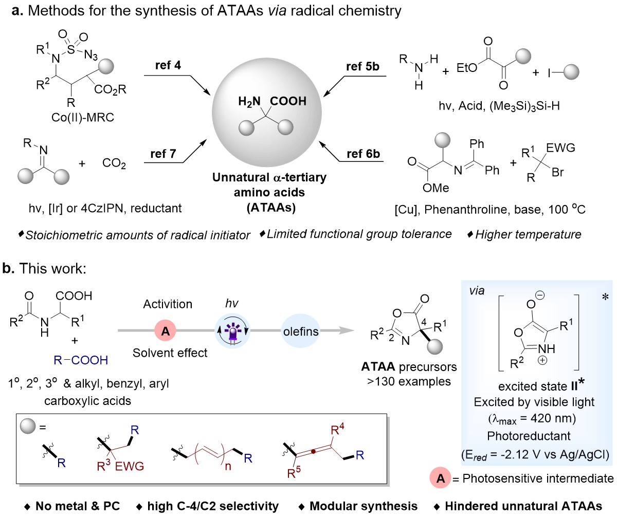 非天然α-季碳氨基酸(ATAAs)在天然产物和生物活性分子中十分丰富,引起了合成化学家和药物化学家们的广泛关注。尽管ATAAs的合成已经得到了广泛研究,但开发廉价且简便的方法来合成多样化的ATAAs仍然具有挑战性。其中酶催化和过渡金属催化(Strecker reactions)的方法合成ATAAs最为常见。然而,这些策略普遍存在官能团耐受性差、所需试剂毒性大、合成步骤多等诸多弊端。近年来也发展了操作简单、绿色经济的自由基手段来合成ATAAs(图1)。但多数反应需要当量的自由基引发剂、较高的温度及多步合成的催化剂。因此,开发一种新策略来实现非天然α-季碳氨基酸的高效构建具有重要意义。